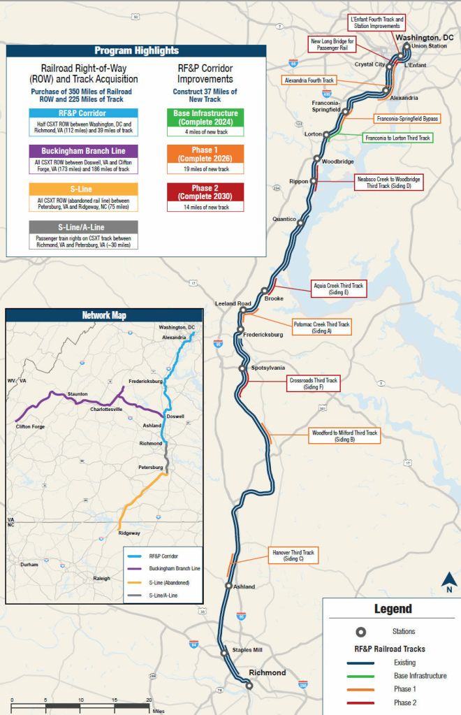 The second is the 197km (123mi) extension of the Northeast Corridor from Washington, DC, via CSX’s RF&P Subdivision, to Richmond, VA. Since the 2000s, Amtrak has been incrementally improving service in Virginia, expanding their network and adding new services, but truly frequent service has been held back by the capacity constraints caused by sharing tracks with freight rail, particularly on the 2-track Long Bridge between DC and Alexandria. These issues are currently being addressed through a $1.9B upgrade program led by the State of Virginia, which will also be purchasing the parts of the right-of-way between DC and Richmond from CSX.