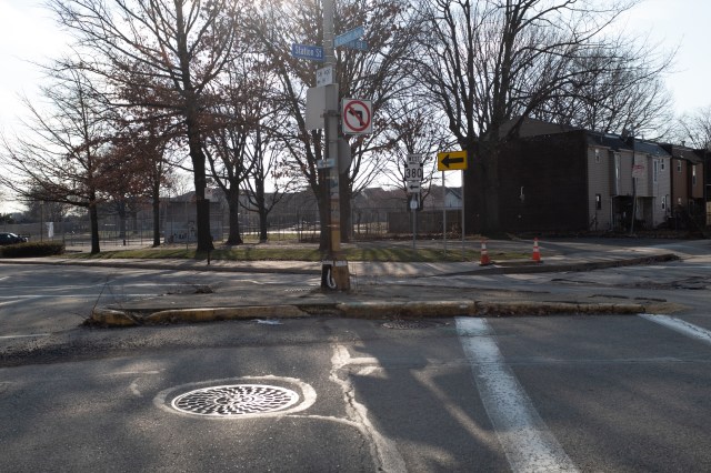 Other sections of the former Penn Circle, where the road went around corners, involve these two-stage pedestrian crossings—requiring users to cross slip roads that drivers sometimes take at speed, and wait on islands in the middle of the road.