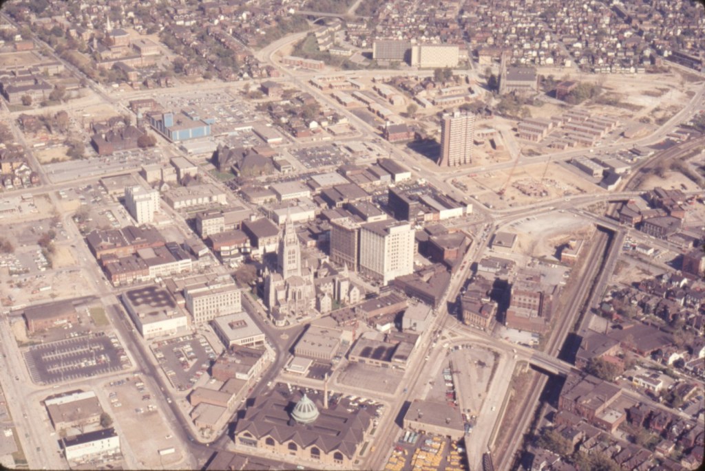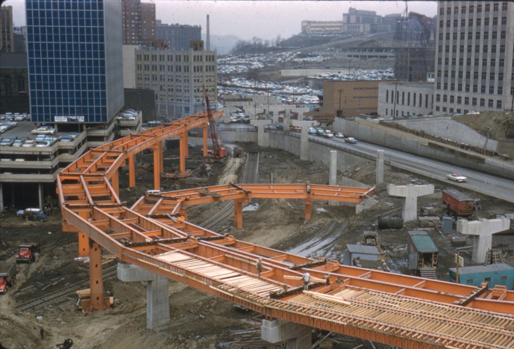 Pittsburgh has been shaped heavily by ambitious redevelopment projects which took place throughout the past 60 years. These projects, forming a period known as Pittsburgh’s “renaissance,” often focused on increasing ease of mobility for people traveling by car—but this is not everybody. Central to Pittsburgh’s mid-century redevelopment was the highway program, which set out plans to construct most of the highways we know in Pittsburgh today, including those encircling Downtown Pittsburgh.