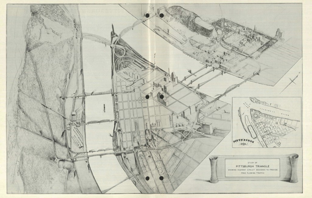 Citizens Committee on City Plan of Pittsburgh. “Study of Pittsburgh Triangle Showing Highway Circuit Designed To Provide Free Flowing Traffic.” Progress 12, no. 93 (1941). Pittsburgh City Archives. https://digitalarchives.powerlibrary.org/papd/islandora/object/papd%3A142009